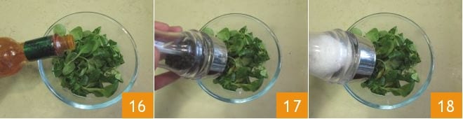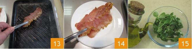 Cocina el speck por unos instantes 13, el tiempo necesario para hacerlo crujiente, y luego transfiérelo a un plato 14. Ahora ocupaos de la ensalada: lava y seca el canónigo y colócalo en un bol, aliña con aceite de oliva 15,