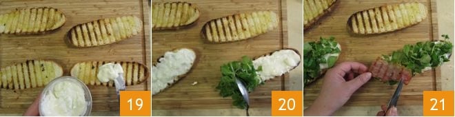 Todo está listo para componer los bocadillos: toma una rebanada de pan tostado, unta encima el queso 19, luego coloca las hojitas de canónigo 20 y las lonchas de speck a la parrilla 21;