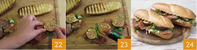 para terminar, coloca también los higos caramelizados 22 y aliña con unas gotas de tabasco 23. Cierra el bocadillo con la otra rebanada de pan y sírvelo de inmediato 24!