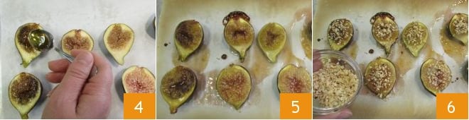 Rocía la superficie de los higos con una cucharadita de miel 4, luego pásalos al grill del horno a 240° durante 3-4 minutos, para caramelizarlos y dorarlos en la superficie 5. Luego distribuye sobre los higos las avellanas trituradas 6 y reserva.