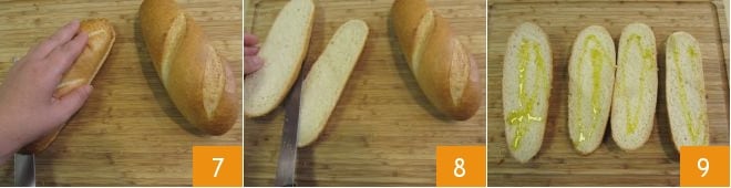 Corta los bocadillos por la mitad (7-8), aliña con un hilo de aceite 9