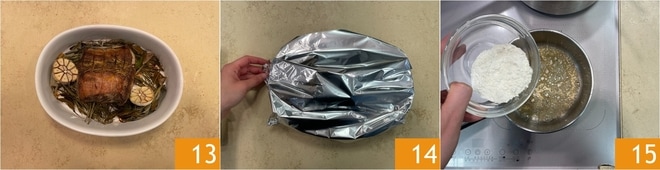 Cuando el roast beef esté listo, sacadlo del horno 13 y cubridlo con una hoja de papel de aluminio 14. Dejad reposar al menos 15 minutos. Mientras tanto, preparad la salsa. Verted la mantequilla en un cazo y dejad que se derrita. Agregad la harina de una vez 15.