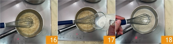 Mezclad rápidamente con un batidor hasta obtener un roux ámbar 16. Luego verted la leche 17 y mezclad bien con un batidor 18, evitando la formación de grumos.