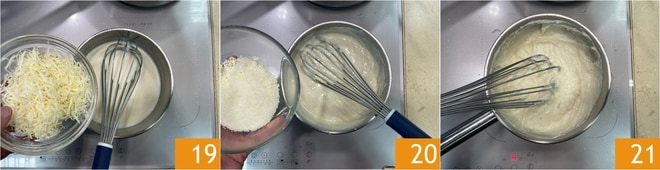 En cuanto la salsa comience a espesar, añadid el queso Comté 19 y el Parmigiano Reggiano DOP 20, ambos rallados. Ajustad con pimienta y continuad mezclando hasta que los quesos se hayan derretido 21.