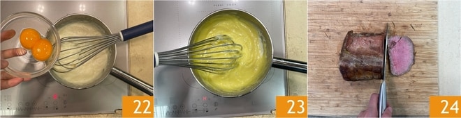 Añadid las dos yemas 22 y mezclad hasta que estén bien incorporadas 23. En este punto, retomad la carne y cortadla en rodajas finas 24.