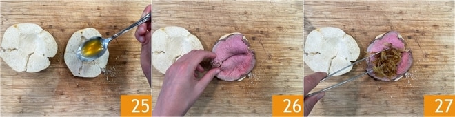 Cortad la chapata por la mitad y si preferís, tostádla en una sartén. Humedece el pan con los jugos de la carne 25, luego colocad dentro un par de rodajas 26. Añadid las cebollas caramelizadas 27.