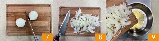 Mientras tanto, preparad también las cebollas. Peladlas y cortadlas primero por la mitad 7 y luego en rodajas finas 8. Verted en una olla un chorrito de aceite y las cebollas 9.