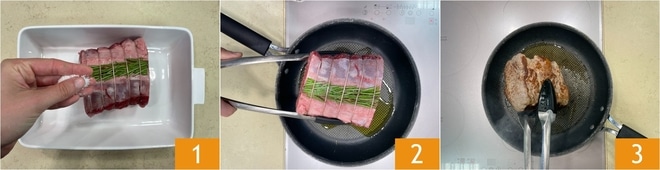 Para preparar el bocadillo con roast beef y cebollas caramelizadas, empezad con la carne. Necesitaréis un trozo ya atado con una ramita de romero. Secad la carne y salarla abundantemente 1, luego trasladadla a una sartén con un chorrito de aceite caliente 2 y doradla bien por todos los lados para sellarla 3 a fuego alto.