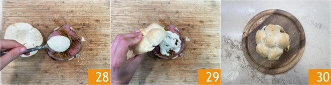 Concluid con la salsa 28. Cerrad el bocadillo 29 y servidlo 30.