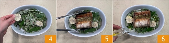 Mientras tanto, en una bandeja de horno colocad las hierbas aromáticas y la cabeza de ajo dividida por la mitad 4. Cuando la carne esté bien dorada, colocadla sobre las hierbas 5 y añadid un chorrito de aceite 6. Cocinad en horno estático precalentado a 220° durante 15 minutos, luego bajad la temperatura a 180° y cocinad durante 11 minutos más. Deberéis obtener una temperatura interna de 48-50° que podréis medir con una sonda.