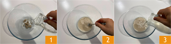 Para preparar los bocadillos napolitanos, la primera cosa que hay que hacer es verter la levadura desmenuzada y el agua en un bol grande 1. Mezclad con un tenedor para disolverla 2, luego añadid la leche 3.