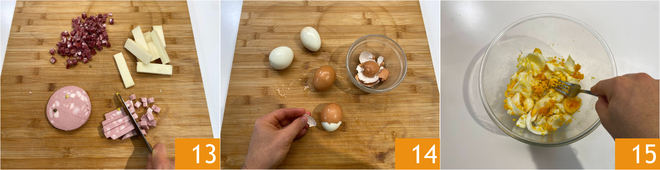 Mientras, cortad el salami y la mortadela en cubos 13 y el queso. Una vez que los huevos estén cocidos, enfriadlos bajo agua corriente y peladlos 14. Cortadlos en rodajas y aplastadlos con un tenedor en otro bol 15.
