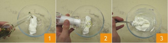 Para preparar los bocados de hojaldre con queso y miel, lo primero que hay que hacer es condimentar el queso de cabra con un chorrito de aceite 1, sal 2 y pimienta y mezclar para obtener una crema homogénea 3.