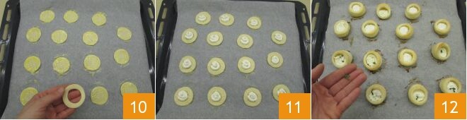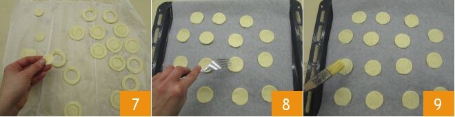 luego retira la parte central para obtener anillos de un ancho de 1 cm 7. En este punto, pincha los discos que has colocado en la bandeja para hornear con un tenedor 8 y pincélalos con la mezcla de leche y yema que habrás batido previamente 9.