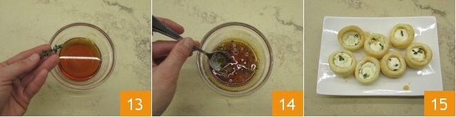 Finalmente, vierte la miel de castaño en un bol, añade el tomillo deshojado 13 y mezcla bien 14. Decora tus bocados de hojaldre con queso y miel con la miel al tomillo y sírvelos con el bol aparte 15!