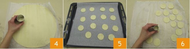 Desenrolla la masa de hojaldre sobre la superficie de trabajo y saca 40 discos con un cortapastas de un diámetro de 3,5 cm 4, luego transfiere 20 de estos discos a una bandeja para hornear forrada con papel de horno 5. Corta los discos restantes con un cortapastas más pequeño, de un diámetro de 2,5 cm 6,
