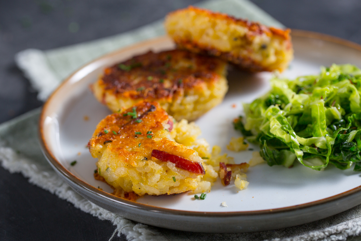 Una vez dorados de un lado, dales la vuelta 16 17. Sirve los canederli de arroz acompañados de repollo finamente picado y aliñado con aceite, vinagre, sal, pimienta y comino 18. Puedes aromatizar con más cebollino al gusto.