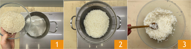 Para preparar los canederli de arroz, comienza hirviendo el arroz en una olla con abundante agua salada al gusto, durante unos 12 minutos 1. Transcurrido este tiempo, escurre el arroz 2 y enfríalo en un bol en el frigorífico 3; puedes cubrirlo con film.
