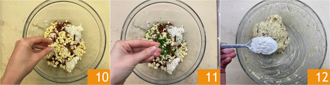 Sazona con una pizca de sal 10, cebollino y pimienta 11. Mezcla, luego agrega la harina (puedes ajustar la consistencia añadiendo poca a poco para ver si será necesaria toda la cantidad indicada) 12.