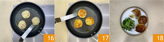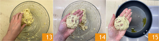 Amasa hasta que la mezcla esté compacta 13. Forma medallones de aproximadamente 90 g cada uno 14 y sofríelos en una sartén antiadherente con un poco de aceite a fuego medio 15.