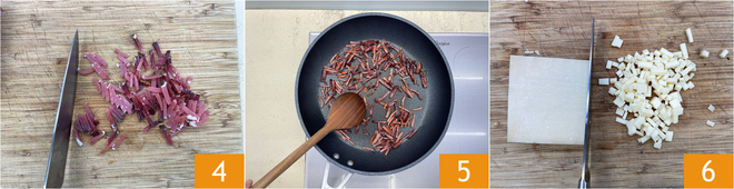 Mientras tanto, corta el speck en trocitos finos 4 y sofríelo en una sartén antiadherente sin añadir grasas 5. Corta también el queso en cubitos muy pequeños 6.