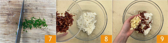 Pica finamente el cebollino 7. En este punto, es el momento de amasar: en un bol, mezcla el arroz, el speck 8, el queso 9 y los huevos.