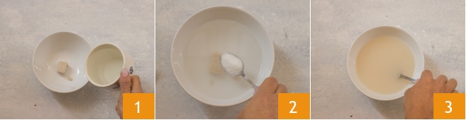 Para preparar los bollitos suaves con anchoas, comenzad vertiendo la levadura de cerveza desmenuzada en un bol, añadid el agua a temperatura ambiente 1 y el azúcar 2. Mezclad bien todo con un tenedor 3