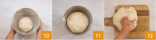 Volved a poner la masa en el recipiente de la batidora y cubrid con film 10, dejad reposar unas 2 horas, hasta que el volumen se haya duplicado 11. Luego comenzad a tomar porciones de masa de 60 g cada una, en total obtendréis unas 13 piezas 12.
