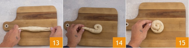Formad cilindros de unos 20 cm 13 y luego enrolladlos sobre sí mismos firmemente 14 hasta formar una espiral 15.