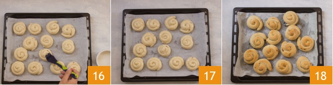 Colocad los bollitos en una bandeja con papel de horno y pincelad con un poco de aceite de semillas 16. Cubrid y dejad reposar otros 15 minutos 17. Mientras tanto, calentad el horno a 180° y hornead los bollitos durante unos 20 minutos 18.