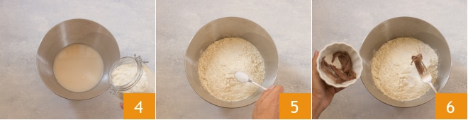 y transferid todo al recipiente de la batidora planetaria. Luego añadid la harina 4, la sal 5 y los filetes de anchoas, o boquerones, escurridos del aceite 6.