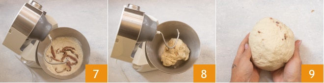 Colocad el gancho 7 y poned en marcha la batidora planetaria durante unos 5 minutos o hasta que todos los ingredientes estén bien compactados 8. Transferid la masa a la superficie de trabajo y trabajadla un momento hasta obtener una bola lisa 9.