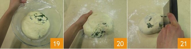 Transcurrido el tiempo de reposo 19, transfiera la masa a una superficie ligeramente enharinada 20 y corte 8 piezas de 100-110 g 21.