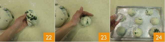 Dale a cada porción una forma esférica 22, luego redondee la masa girándola sobre una superficie 23 y transfiera poco a poco a una bandeja. En este punto, espolvoree la superficie con un poco de harina 24.