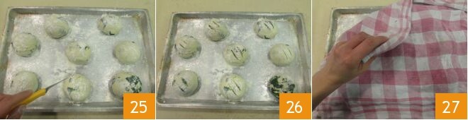 y haga dos cortes en la superficie de cada bollo (25-26). Cubra con un paño 27.