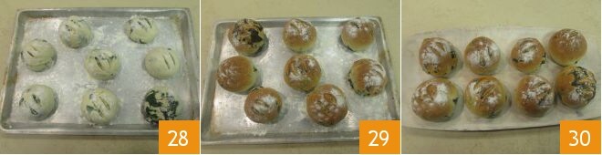 y deje reposar durante otros 40 minutos 28. Hornee en horno estático en el estante central a 190°C durante unos 30 minutos. Cuando estén bien dorados, saque del horno sus bollos con grelos 29 y deje que se templen antes de servirlos 30.