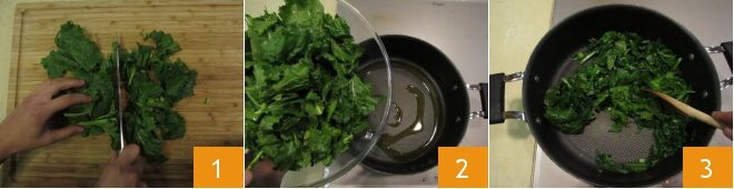 Para preparar los bollos con grelos, primero lave los grelos, luego córtelos en trozos con un cuchillo 1. Caliente un poco de aceite en una cacerola, agregue los grelos 2 y cocínelos removiendo de vez en cuando 3.