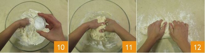y comience a amasar. Antes de que se absorba completamente, agregue también la sal 10. Continúe trabajando la mezcla 11, luego transfiérala a una superficie enharinada y amase hasta obtener una masa homogénea 12.