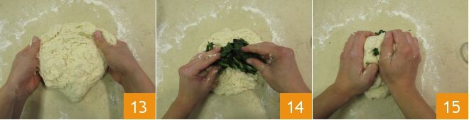 En este punto, extienda la masa 13 y coloque los grelos bien fríos en el centro 14. Amasar con las manos para incorporarlos a la masa 15, agregando más harina si resulta demasiado húmeda.