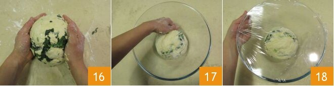 Trabaje la masa por otros 5 minutos, luego déle una forma esférica 16 y colóquela en un bol 17. Cubra con film transparente 18 y deje reposar durante al menos 3 horas, hasta que haya duplicado su volumen.