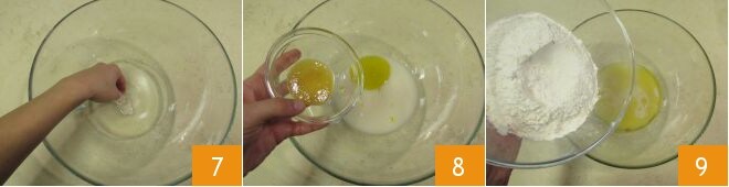 mezcle con las manos o con una cuchara para disolverlo completamente 7. Añada el aceite y la miel 8, luego agregue gradualmente la harina 9.