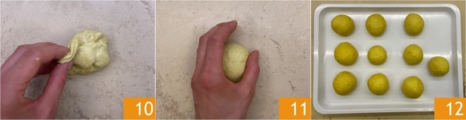 Tomad cada trocito y formad bolitas, luego llevad los bordes hacia el centro 10, voltead la masa y rodadla para obtener una forma esférica 11. Colocad las bolitas en una bandeja 12 y dejadlas reposar, cubiertas con un paño.
