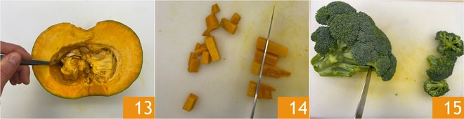Mientras tanto, preparad el relleno: limpiad la calabaza de semillas y filamentos internos 13, quitad la piel y cortad la pulpa en trozos 14. Dividid el brócoli en floretes pequeños 15.