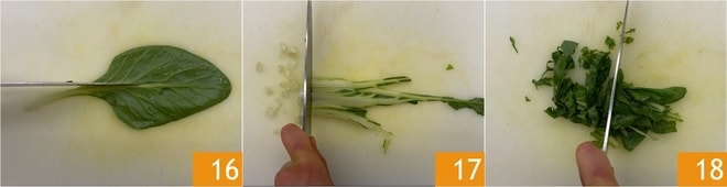 Separad el tallo de las acelgas de la hoja 16, luego cortad en trocitos tanto los tallos 17 como las hojas 18.
