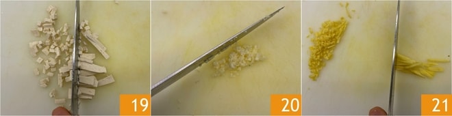 Reducid el tofu a cubitos 19. Finalmente, picad finamente el ajo, al que habréis quitado el germen interno 20, y el jengibre pelado 21.