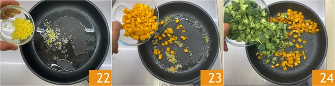 Verted el ajo y el jengibre en una sartén con un poco de aceite de semillas 22 y dejad sofreír a fuego bajo durante unos 5 minutos. Agregad la calabaza 23 y dorad durante 5 minutos más, luego añadid los brócolis 24.