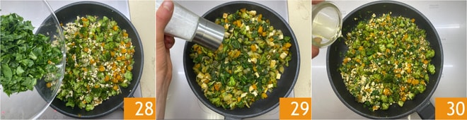 Añadid también los tallos de las acelgas 25 y el tofu 26, luego dorad durante otros 5 minutos. En este punto, verted un poco de agua 27, bajad el fuego y cocinad durante unos 10 minutos.