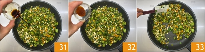 Verted la salsa de soja 31 y la salsa sriracha 32, luego mezclad bien todo 33. Reservad.