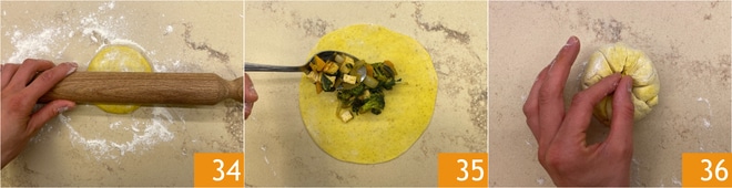 Retomad las bolitas de masa y estiradlas en la mesa ligeramente enharinada para formar discos finos 34. Añadid en el centro de cada disco unos 60 g de relleno 35, luego plegad los bordes hacia el interior y pellizcadlos para sellar los paquetitos 36. A medida que forméis los bollos, colocadlos en una bandeja volteados.