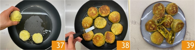 Calentad el aceite de semillas en una sartén y colocad los bollos con la parte pellizcada hacia abajo 37. Dejad que se doren de un lado, luego dales la vuelta y continuad la cocción a fuego medio-bajo 38; en total tomará unos 15 minutos. Acompañad vuestros veggie buns al curry con salsa de soja y servidlos aún calientes 39!